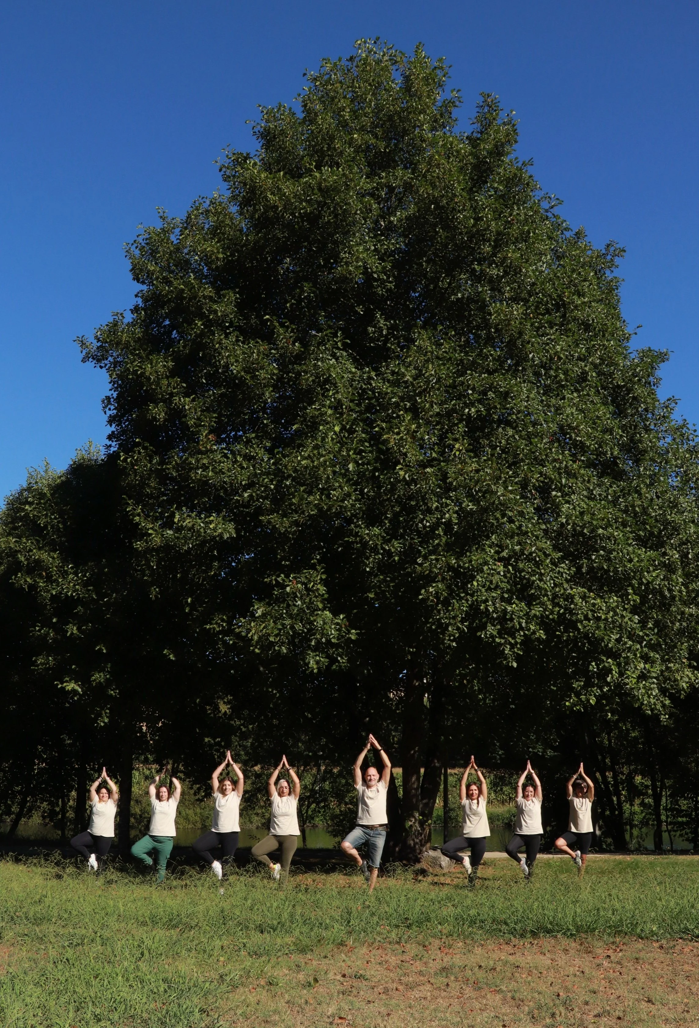 The root system of trees - and possibly the filaments of fungi intertwining with the tips of tree roots in the so-called mycorrhizal networks - can communicate and transfer resources between trees. Vrksāsana वृक्षासन, the tree pose used in Hatha yoga, has the benefits of improving balance and opening the hips, strengthening the ankles and legs, strengthening and lengthening the spine and improving focus and concentration. This connects us to the ecosystem and we have the habit, when we do workshops outdoor, to start with the Vrksāsana next to the biggest tree we can find.